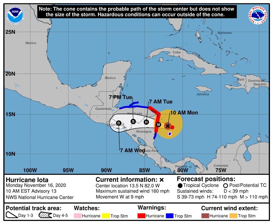 A partir de las 10:00 a.m. hora estándar del Este (a las 9:00 a.m. de El Salvador) de este lunes 16 de noviembre, el centro de Iota estaba ubicado frente a Nicaragua a 9 millas por hora (15 kilómetros por hora) con vientos máximos sostenidos de aproximadamente 160 millas por hora (260 kilómetros por hora), de acuerdo a los datos del avión Cazahuracanes de la Fuerza Aérea.