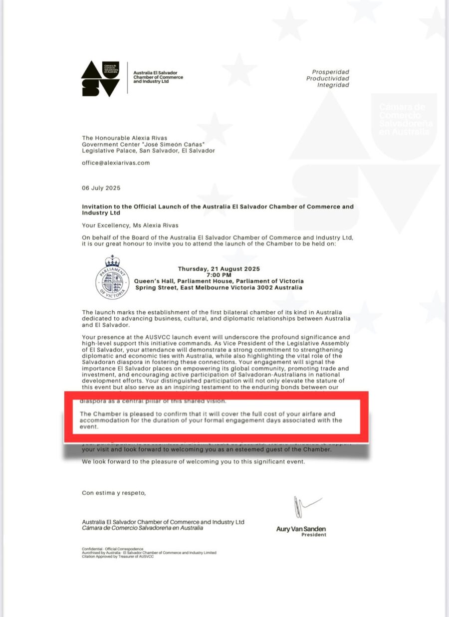 Como vicepresidenta de la Asamblea Legislativa de El Salvador, su asistencia demostrará un firme compromiso con el fortalecimiento de los lazos diplomáticos y económicos con Australia, a la vez que destacará el papel vital de la diáspora salvadoreña en el fomento de estas conexiones", indica la carta.
