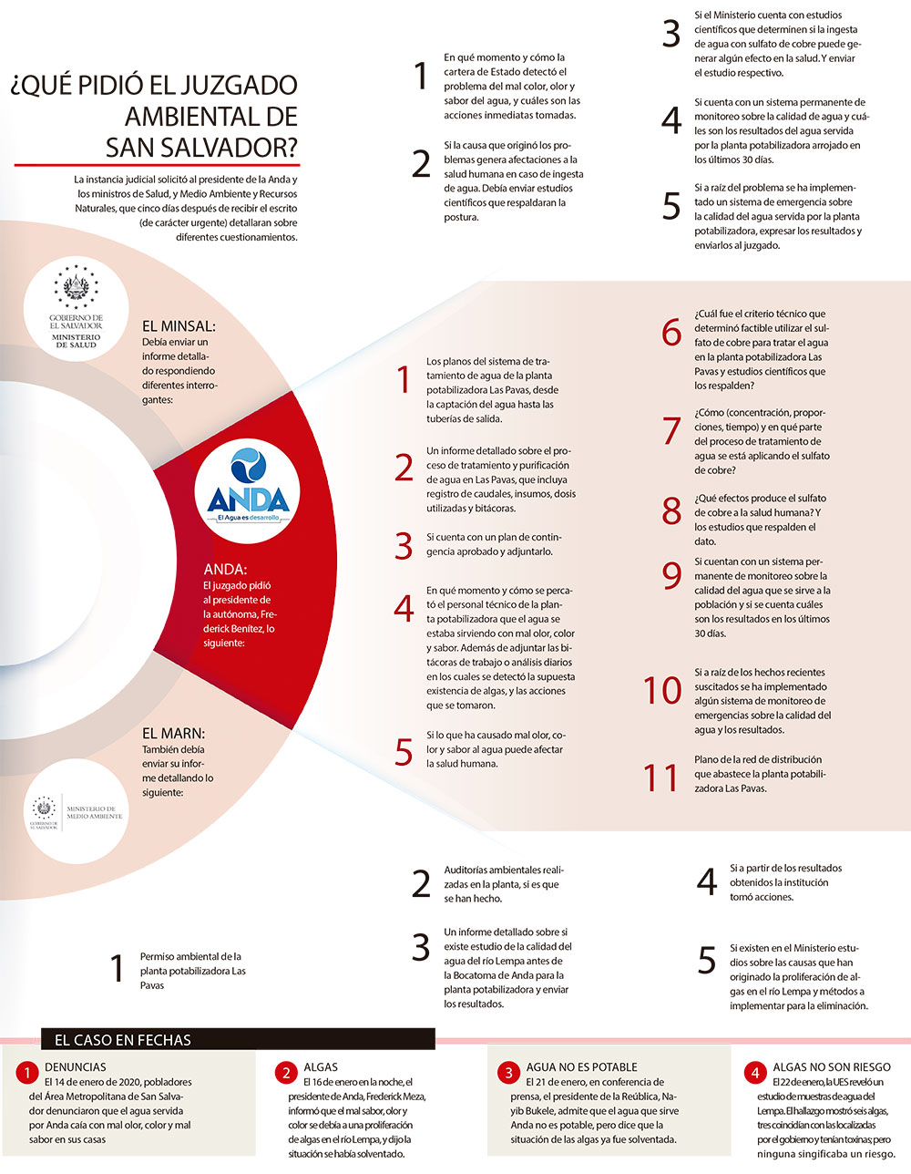 Tras la respuesta del Minsal, que se suma a los informes enviados por la Anda y el Ministerio de Medio Ambiente y Recursos Naturales (MARN), el Juzgado Ambiental de San Salvador con sede en el Centro Judicial Integrado de Santa Tecla espera ahora que la autónoma envíe sus anexos (mandó su informe pero falta documentación) para que un equipo de la Unidad de Medio Ambiente de la Corte Suprema de Justicia emita una opinión al respecto.