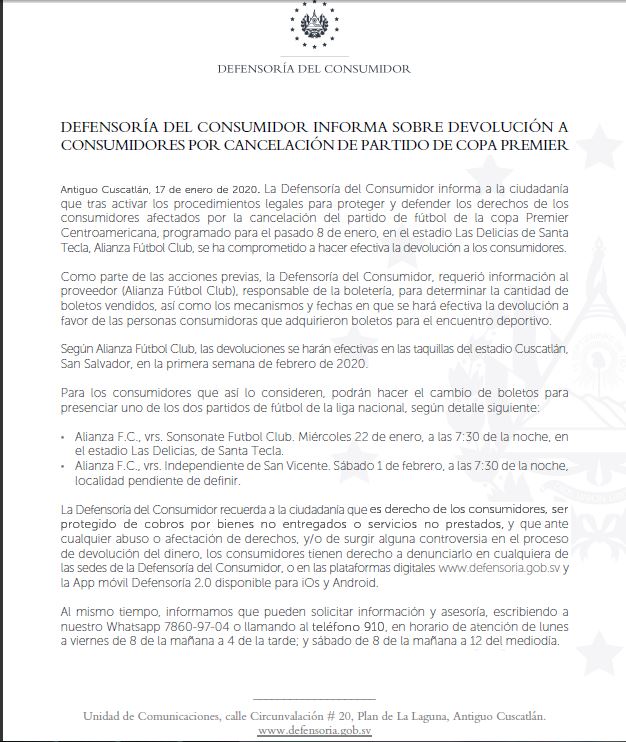 De acuerdo al club, que fue consultado por la Defensoría, la devolución se realizará en las taquillas del estadio Cuscatlán durante la primera semana de febrero, y que los consumidores que lo consideren, pueden hacer el canje entre los partidos: “Alianza F.C., vrs. Sonsonate Futbol Club. Miércoles 22 de enero, a las 7:30 de la noche, en el estadio Las Delicias, de Santa Tecla”, o el partido “Alianza F.C., vrs. Independiente de San Vicente. Sábado 1 de febrero, a las 7:30 de la noche, localidad pendiente de definir”.