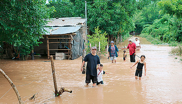Adultos y niños caminan en medio de las inundaciones en caserío Casa Mota, cantón El Brazo, San Miguel, uno de los territorios más devastados por la tormenta. / DEM