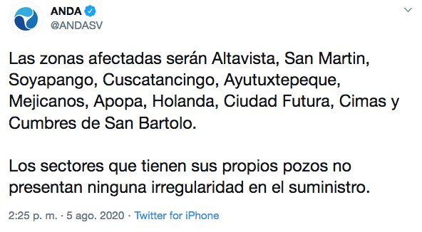 “Las zonas afectadas serán Altavista, San Martín, Soyapango, Cuscatancingo, Ayutuxtepeque, Mejicanos, Apopa, Holanda, Ciudad Futura, Cimas y Cumbres de San Bartolo”.