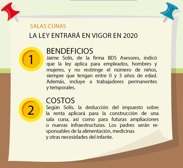 Para Jaime Solís, socio de la firma especialista en derecho laboral BDS Asesores, la ley honra una deuda histórica con los trabajadores y aseguró que beneficiará a los patronos, pues contar con espacios adecuados para el cuido de infantes “será una oportunidad que impactará de manera positiva en la productividad de los empleados e incentivará a más personas para acceder a un empleo”.