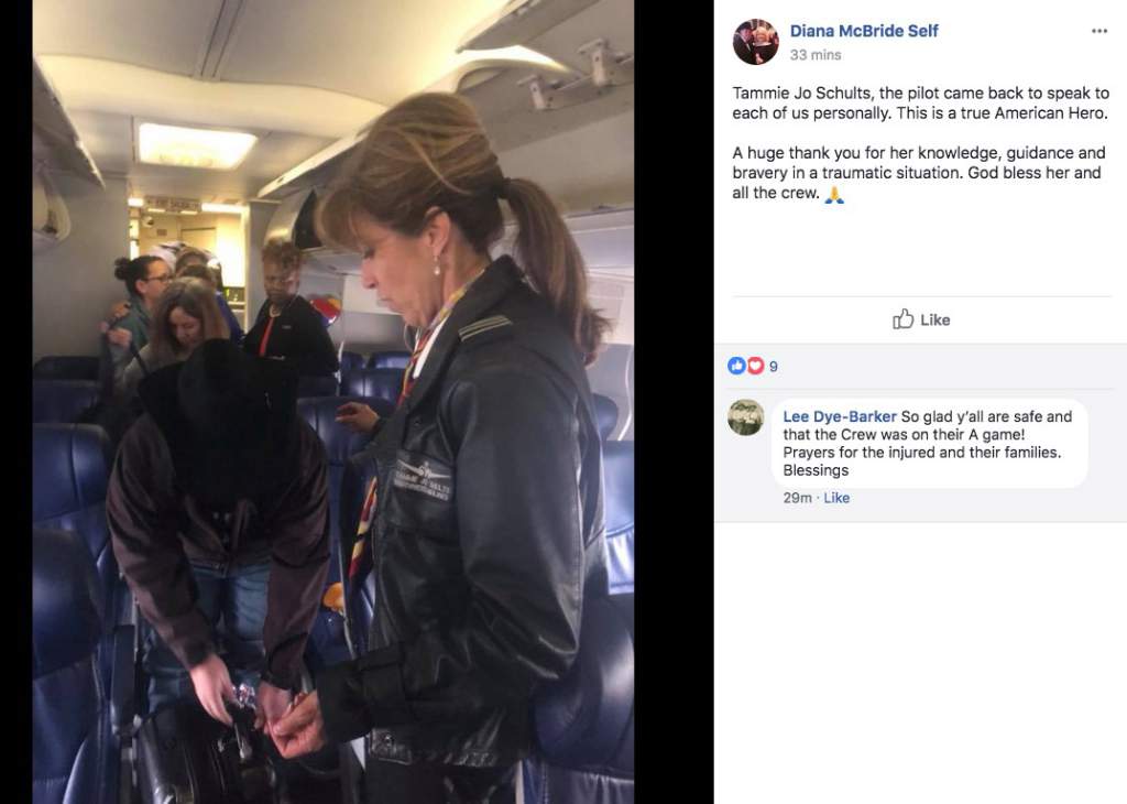 "Esta es una verdadera héroe estadounidense", escribió otra pasajera, Diana McBride, en Facebook, que celebró "el conocimiento y valentía" de la piloto y contó que tras el aterrizaje, Shults "vino a hablar con cada uno de nosotros personalmente".