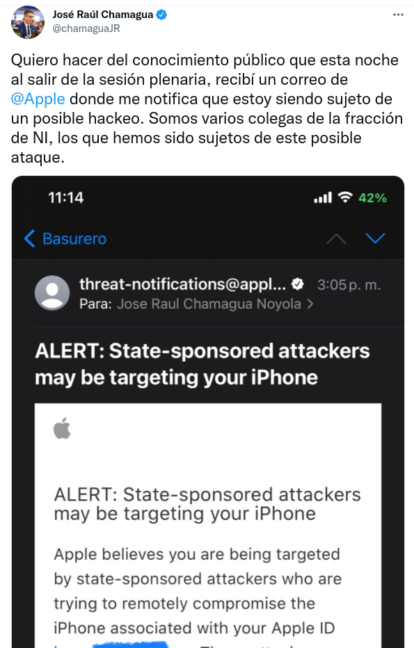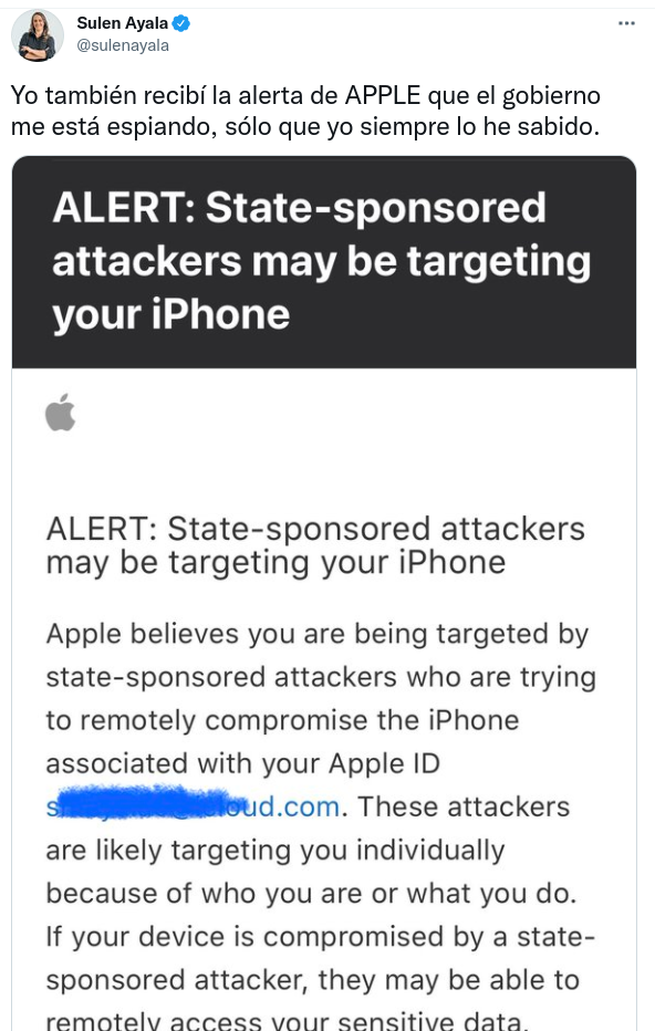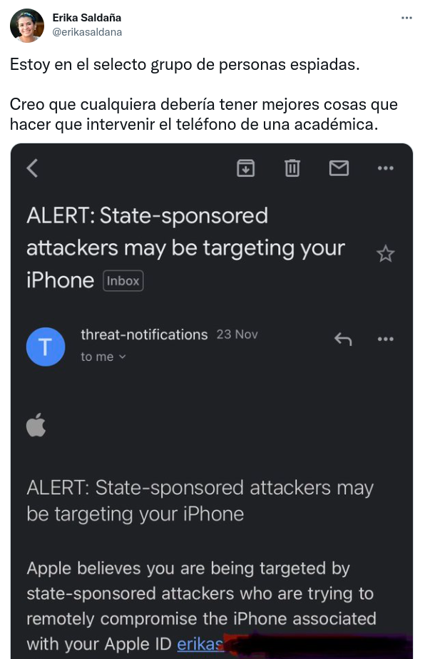 Apple cree que estás siendo apuntado por atacantes patrocinados por el Estado, quienes están tratando de comprometer de forma remota a tu iPhone asociado al Apple ID. Estos atacantes probablemente te apuntan individualmente por quién eres o lo que haces". Alerta de Apple enviada a periodistas de Diario El Mundo.A través de un correo electrónico enviado la tarde y noche del martes, la empresa estadounidense calificó como "urgente" el mensaje, debido a una "alta probabilidad" de que los teléfonos de sus usuarios estuvieran siendo "comprometidos de forma remota" por atacantes, que según la misma empresa, son pagados por el Estado.