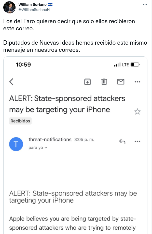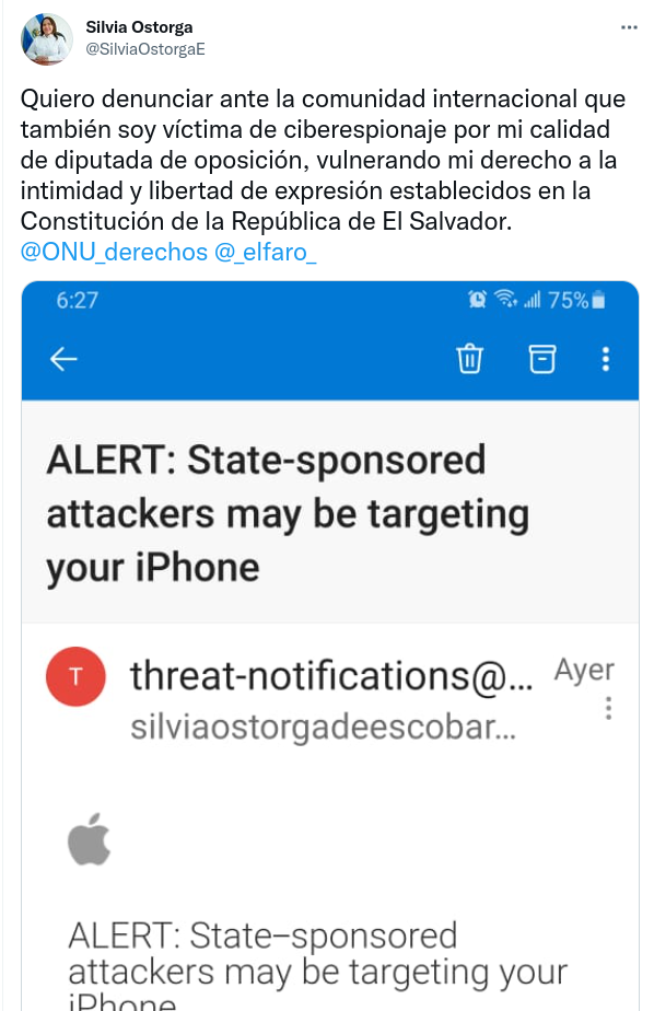 La alerta se emitió en todo el mundo a cientos de periodistas, políticos y activistas por los derechos civiles. En el caso de El Salvador, estas llegaron a los dispositivos de periodistas, políticos y ciudadanos con el mensaje en inglés: "ALERTA: Atacantes patrocinados por el Estado pueden estar apuntando a tu iPhone".