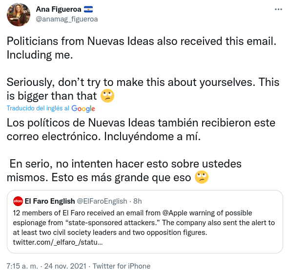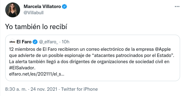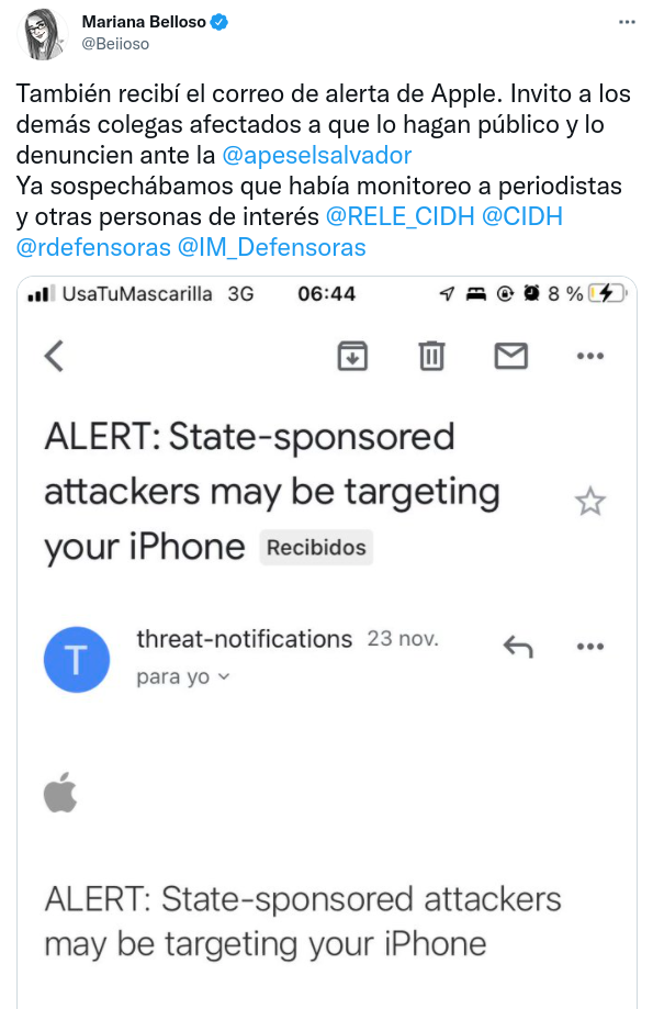 Si el dispositivo se ve comprometido por un atacante patrocinado por el Estado, es posible que pueda acceder de forma remota a sus datos confidenciales, comunicaciones o incluso a la cámara y el micrófono (...) Si bien es posible que se trate de una falsa alarma, tómese esta advertencia en serio". Alerta de Apple enviada a periodistas de Diario El Mundo.La alerta de Apple llega solo unas horas después que la compañía estadounidense demandara a la empresa israelí NSO Group, fabricante de Pegasus, el polémico software de espionaje adquirido por decenas de gobiernos en todo el mundo.