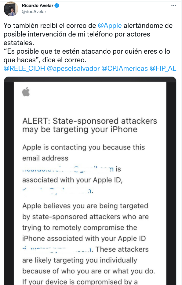 La empresa de tecnología Apple envió un correo electrónico a usuarios de sus teléfonos iPhone en El Salvador, advirtiendo de un "posible espionaje" patrocinado por el Estado, en contra de periodistas, actores de la sociedad civil y políticos, tanto oficialistas como opositores.