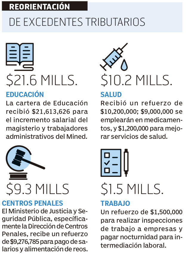 Otros $9,376,785 se destinarán a Centros Penales en lo que resta del año: $4,176,785 serán para salarios, gastos colaterales y aguinaldos de 1,063 plazas contratadas para nueva infraestructura; y otros $5.2 millones son para alimentos de reos. La cartera de Trabajo recibirá además $1.5 millones para continuar inspecciones de trabajo, actividades de intermediación laboral.