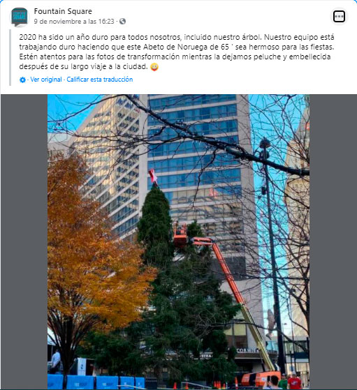 El árbol de navidad, ubicado en la plaza de la fuente en el centro de Cincinnati, mide alrededor de 20 metros de altura y es adornado con una estrella roja en la cima. Lo que llamó la atención de muchos fue el divertido aspecto del árbol al tener huecos y ramas torcidas en toda su extensión.