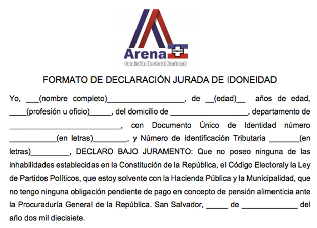 “En caso de no ser elegido candidato guardaré la disciplina y la unidad partidaria, comprometiéndome a apoyar y a trabajar con entusiasmo por la persona que en las elecciones sea elegida como candidato”, indica la declaración. También requerirá solvencia del partido, de la hacienda pública, de la municipalidad y de la Procuraduría General de la República.
