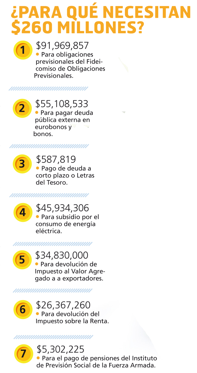 El Gobierno logró recortar $9 millones, luego de la sentencia, pero el pasado 7 de septiembre presentó una nueva iniciativa para aprobar títulos valores y financiar: $91,969,857 al Fideicomiso de Obligaciones Previsionales, $55,108,533 en deuda pública externa en eurobonos y bonos, $587,819 en pago de deuda a corto plazo, $45,934,306 para subsidio por el consumo de energía eléctrica, $34,830,000 en devolución de IVA a exportadores, $26,367,260 en devolución de renta y $5,302,225 en pensiones del Instituto de Previsión Social de la Fuerza Armada (IPSFA).