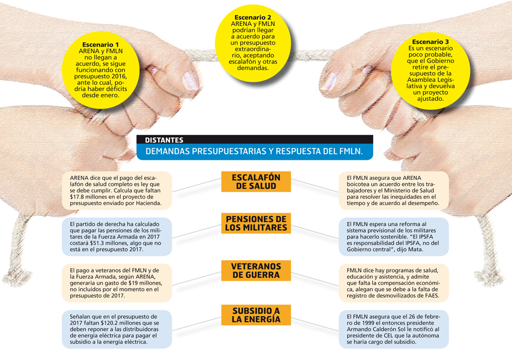 En el FMLN se rechaza una a una las demandas presupuestarias de ARENA, que pide incluir $745.6 millones de aumento salarial en salud, pensiones de militares, pagos a veteranos, subsidio a la energía eléctrica y gas licuado, y otros.
