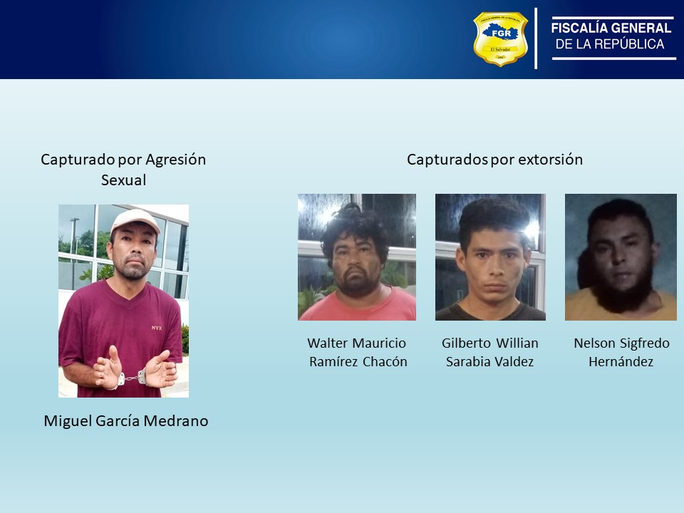 Mientras que, en el municipio de Zacatecoluca, en La Paz, la Fiscalía ordenó la detención de tres miembros de la pandilla 18 Revolucionarios, por el delito de extorsión y de Miguel García Medrano, acusado de agresión sexual en menor e incapaz.