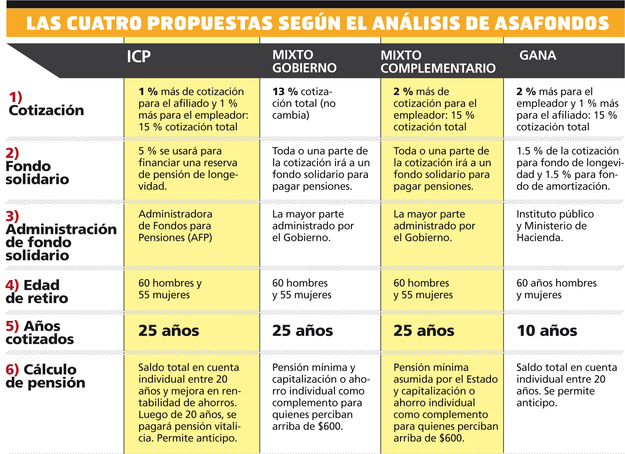 Así lo sostiene en un cuadro comparativo de las propuestas de la Iniciativa Ciudadana para las Pensiones (ICP) –que integra Asafondos–, Gobierno, partido Gran Alianza por la Unidad Nacional (GANA) y por un grupo de sindicatos.