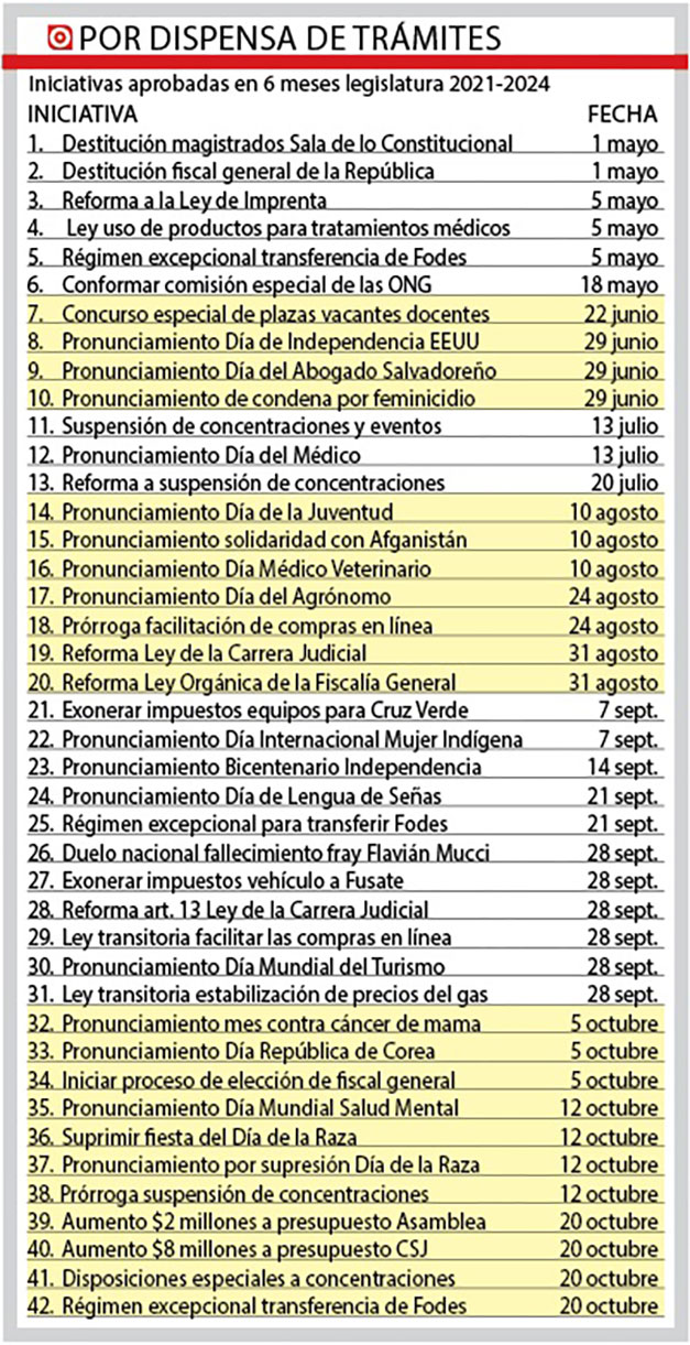 Hasta el 26 de octubre de 2021, la Asamblea Legislativa aprobó 42 iniciativas con dispensa de trámites, algunas polémicas como la denominada “Ley Alabí”.