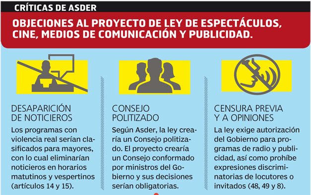 Asder señala que la ley implicaría una censura a programas de opinión porque exige autorización del gobierno a estos programas ante multas de hasta $150,000. El artículo 59, en su inciso a, prohíbe que el locutor o presentador “se exprese de manera indiscriminada” a grupos vulnerables. El artículo 58 prohíbe también que el “invitado” se exprese de manera discriminatoria. El proyecto pasó a estudio de la Comisión de Legislación de la Asamblea Legislativa.