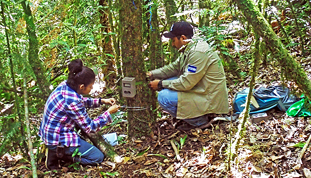 Andrea Morales y un guardabosques montando una cámara de vida salvaje en El Salvador. Foto: Parque Nacional Montecristo.