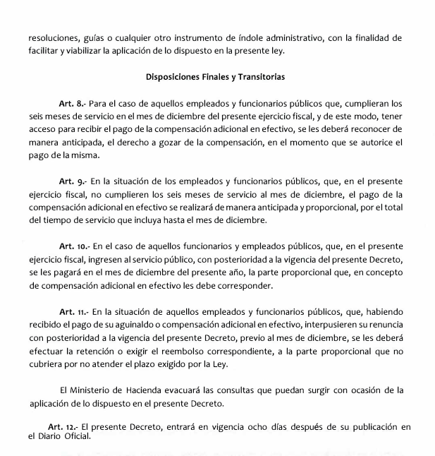 Si los empleados y funcionarios públicos ingresan a trabajar en el sector público después de la entrada en vigencia de este Decreto, se les pagará en el mes de diciembre del presente año, la parte proporcional que corresponde como compensación adicional en efectivo.