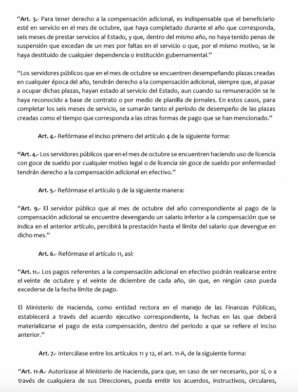 Otra reforma es que los empleados públicos que en el mes de octubre se deben encontrar desempeñando plazas que hayan sido creadas en cualquier época del año; ellos "tendrán derecho a la compensación adicional, siempre que, al pasar a ocupar dichas plazas, hayan estado al servicio del Estado, aun cuando su remuneración se le haya reconocido a base de contrato o por medio de planilla de jornales".