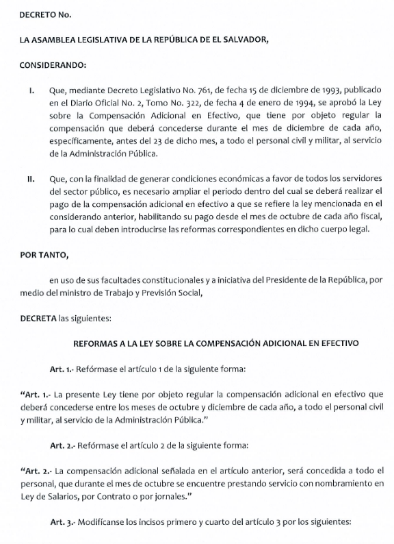 La Asamblea Legislativa aprobó un decreto de reformas a la "Ley de la compensación adicional en efectivo" para ampliar el período de pago desde el 20 de octubre al 20 de diciembre de cada año fiscal, entre otras modificaciones.