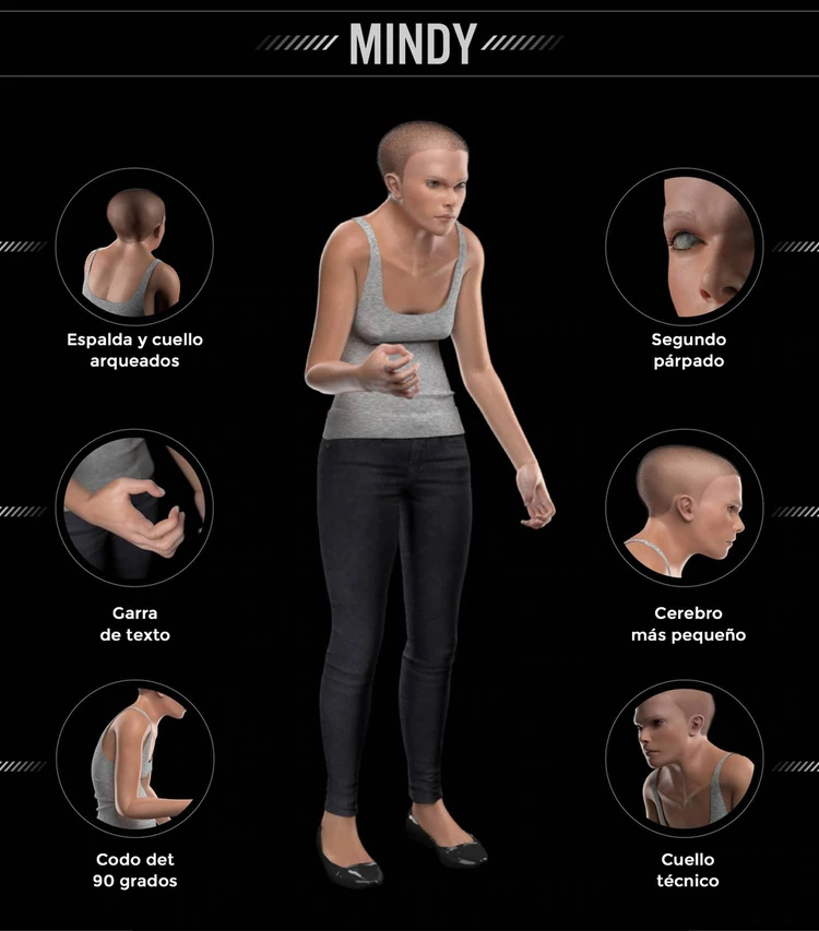 Estas características representan la figura de Mindy: espalda y cuello en posición hacia dentro de su pecho. Sus manos como garra, resultado de sostener el dispositivo por un largo periodo. Su codo doblado en 90 grados.