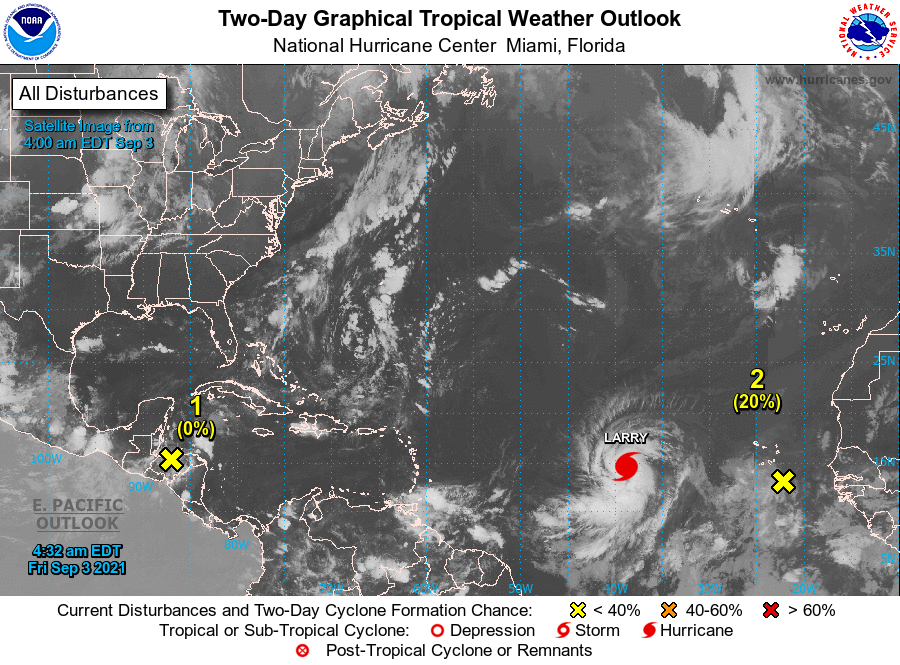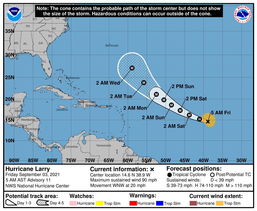 El Centro Nacional de Huracanes (NHC) de la Florida aseguró que monitorean el desplazamiento de Larry que se mueve en mar abierto pero sin una modelo definido sobre su trayectoria.