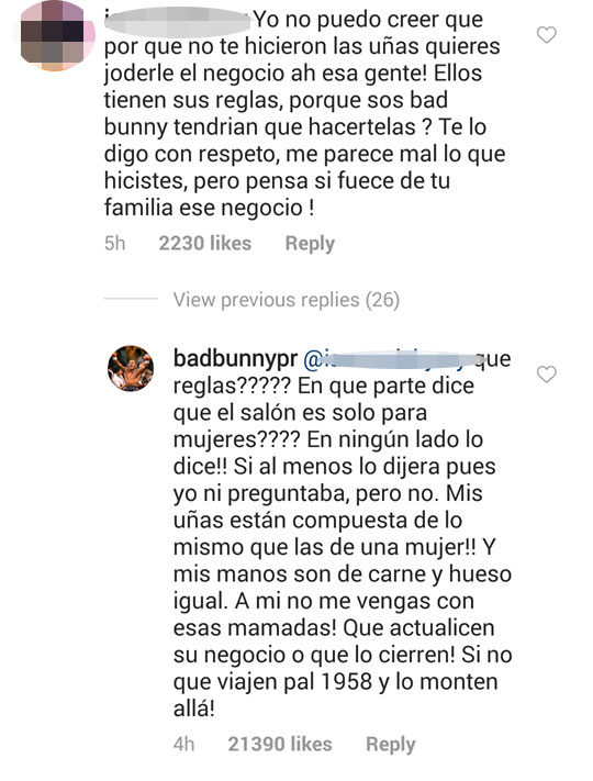 Tras la publicación, algunos de sus seguidores le hicieron ver que cada establecimiento tiene sus reglas, sin embargo, el artista discrepó sobre ese argumentó, ya que sostuvo que en el lugar no especifican que únicamente atienden a mujeres. Otros usuarios le dieron la razón a Bad Bunny y lamentaron que la peluquería no aceptara atenderlo.
