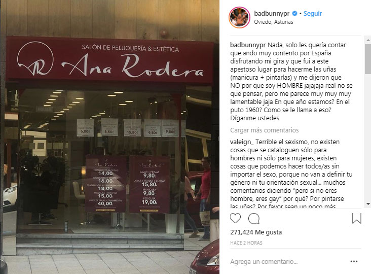 "Nada, solo les quería contar que ando muy contento por España disfrutando mi gira y que fui a este apestoso lugar para hacerme las uñas (manicura + pintarlas) y me dijeron que NO por que soy HOMBRE jajajaja real no se que pensar, pero me parece muy muy muy lamentable jaja En qué año estamos? En el p**o 1960? Cómo se le llama a eso? Díganme ustedes", cuestionó el reguetonero.