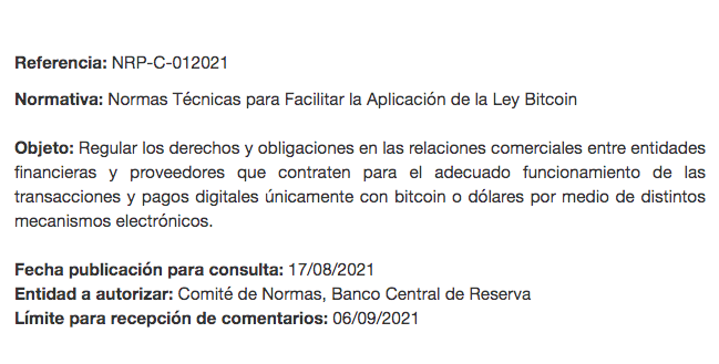 Los documentos “Normas técnicas para facilitar la aplicación de la Ley Bitcoin” y “Lineamientos para la autorización del funcionamiento de la plataforma de la billetera digital para bitcoin y dólares” están disponibles en la sección de regulaciones del portal del BCR . El primer documento tiene una extensión de 24 páginas y el segundo de nueve, lo que contrasta con las apenas nueve páginas que comprenden la ley aprobada a las cero horas del 9 de junio pasado.