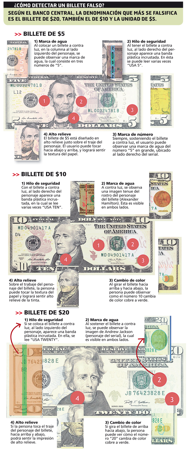 De acuerdo al Banco Central, entre enero y febrero de 2016, la institución retiró del mercado 1,775 hojas de billetes falsos, por un monto de $29,200. Respecto al mismo período para este 2017, el BCR reportó un decomiso de 1,182 denominaciones falsas, valoradas en $21,000. Ello equivalente a una reducción monetaria de $8,200.
