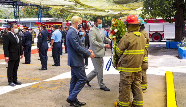 Bomberos El Salvador junto a su director, Edwin Chavarría y el ministro de Seguridad, Mario Durán rindieron honor a los 343 rescatista que perdieron la vida por el atentado.