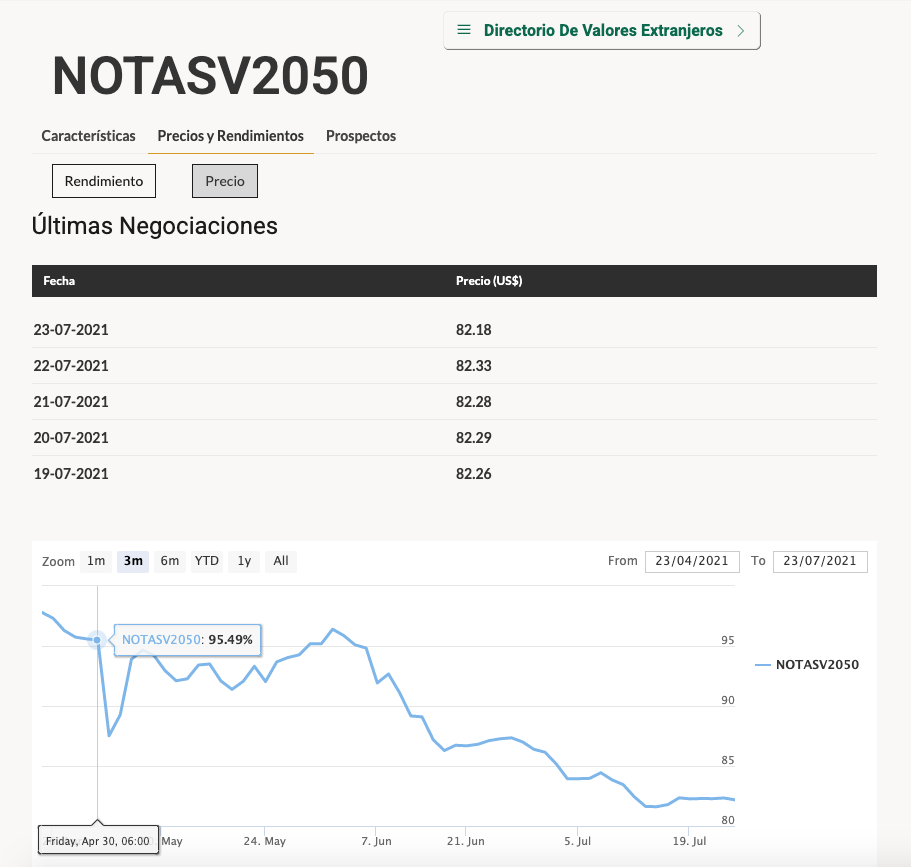 Las estadísticas compiladas en la Bolsa de Valores de El Salvador (BVES) indican que el bono 2023, el más próximo a vencerse, tenía un precio de $105.33 en la jornada del 30 de abril de 2021 y para el lunes 3 de mayo cayó a $100.92.