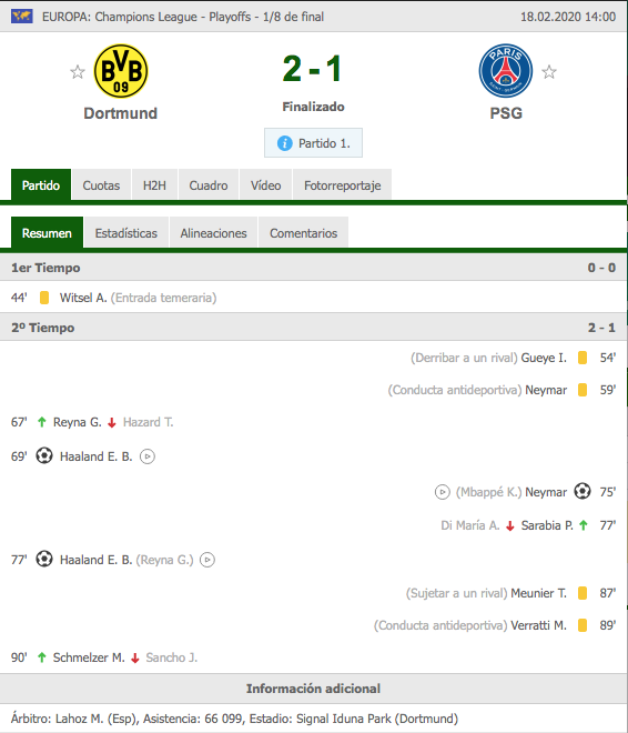 El cuadro parisino todavía no hincó la rodilla, y logró empatar a falta de un cuarto de hora, cuando Mbappé se deshizo de Reyna y Zagadou para servir en bandeja el 1-1 a Neymar. Sin embargo, sin tiempo para respirar, Haaland volvió a aparecer para, desde la frontal, armar un zapatazo que se coló por la escuadra de la portería de Keylor Navas (min.77). La resolución, en el Parque de los Príncipes, llegará el próximo 11 de marzo.