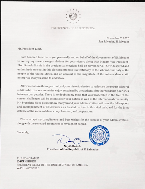 "La participación generalizada y entusiasta en este proceso electoral es un testimonio del vibrante deber cívico del pueblo de los Estados Unidos y un testimonio de la magnitud de la solemne empresa democrática que usted está dispuesto a emprender", dice Bukele a Biden en la misiva.