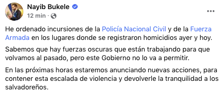 A través de una publicación en su cuenta de Facebook el mandatario dio la orden de “incursiones de la Policía Nacional Civil y de la Fuerza Armada en los lugares donde se registraron homicidios ayer y hoy”.