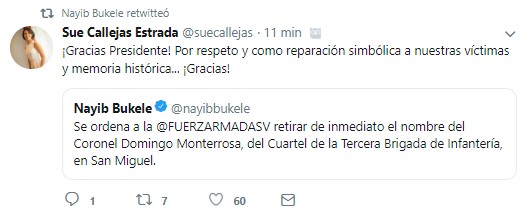 "Se ordena a la @FUERZARMADASV retirar de inmediato el nombre del Coronel Domingo Monterrosa, del Cuartel de la Tercera Brigada de Infantería, en San Miguel", indicó Bukele, por medio de la red social Twitter, canal por el cual comunica, generalmente, sus decisiones.