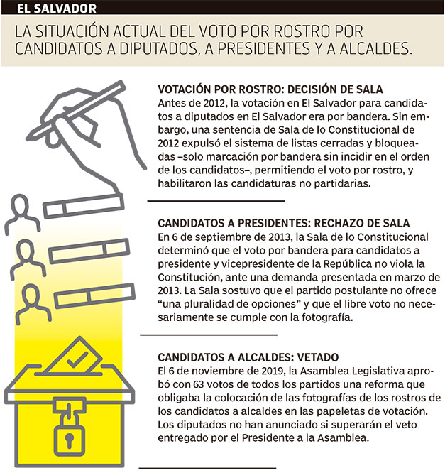 La votación por rostro se practica en El Salvador únicamente para las elecciones de diputados a raíz de una sentencia de la Sala de lo Constitucional, ya que la ley ordena un voto libre, directo, igualitario y secreto.