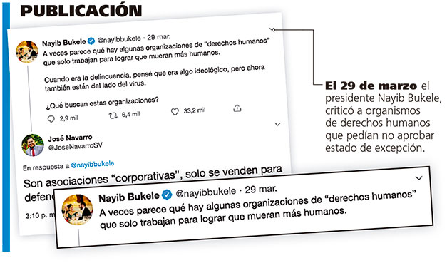 En medio de la discusión debido a la limitación de tres derechos constitucionales –de tránsito, domicilio y reunión– Bukele publicó en su cuenta de Twitter que “hay algunas organizaciones de ‘derechos humanos’ que solo trabajan para lograr que mueran más humanos”.
