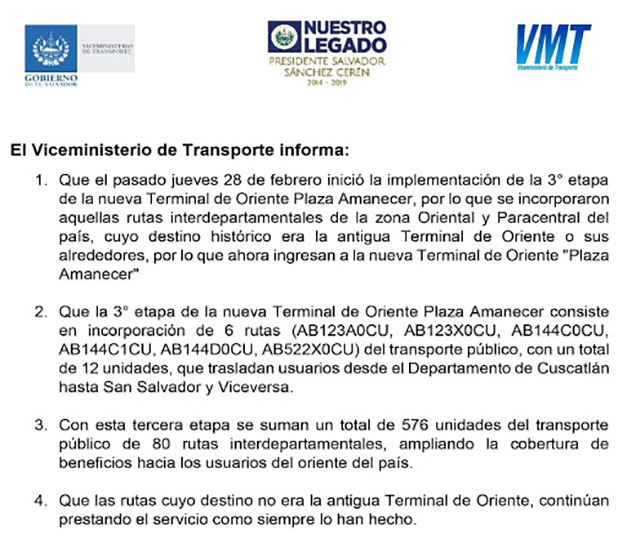 Agregó que mantienen las medidas emitidas el pasado martes: que para la tercera etapa de la terminal Plaza Amanecer solo consiste en la incorporación de seis rutas: la 123a, 123x, 144c, 144c1 y las 522, mientras que las rutas cuyo destino no era la antigua terminal de oriente, continuarán prestando el servicio como siempre lo han hecho.