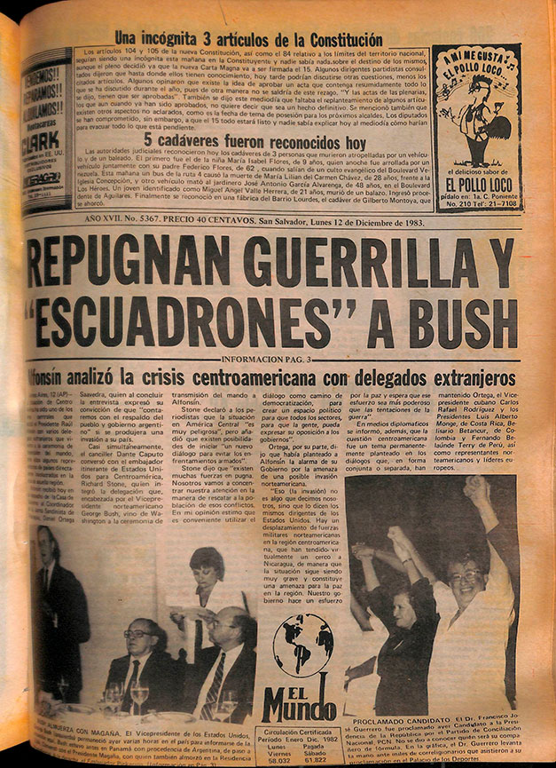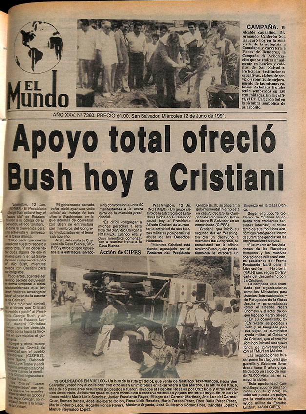 Portadas de El Mundo sobre la visita de Bush a El Salvador en 1983 (izquierda) y de la visita de Alfredo Cristiani a la Casa Blanca en 1991 (derecha).