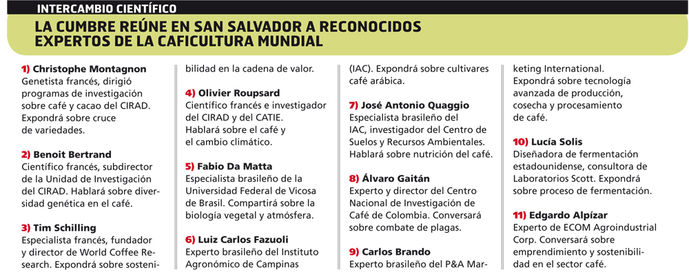 Con una definición clara de que la ciencia es la clave para reactivar el sector cafetalero, desde la noche de este miércoles hasta el próximo 2 de junio, en El Salvador se realiza la primera Cumbre Mundial de Ciencias del Café, en la cual la investigación científica y transferencia de tecnología serán los puntos claves para devolver la productividad y dinamismo al sector.