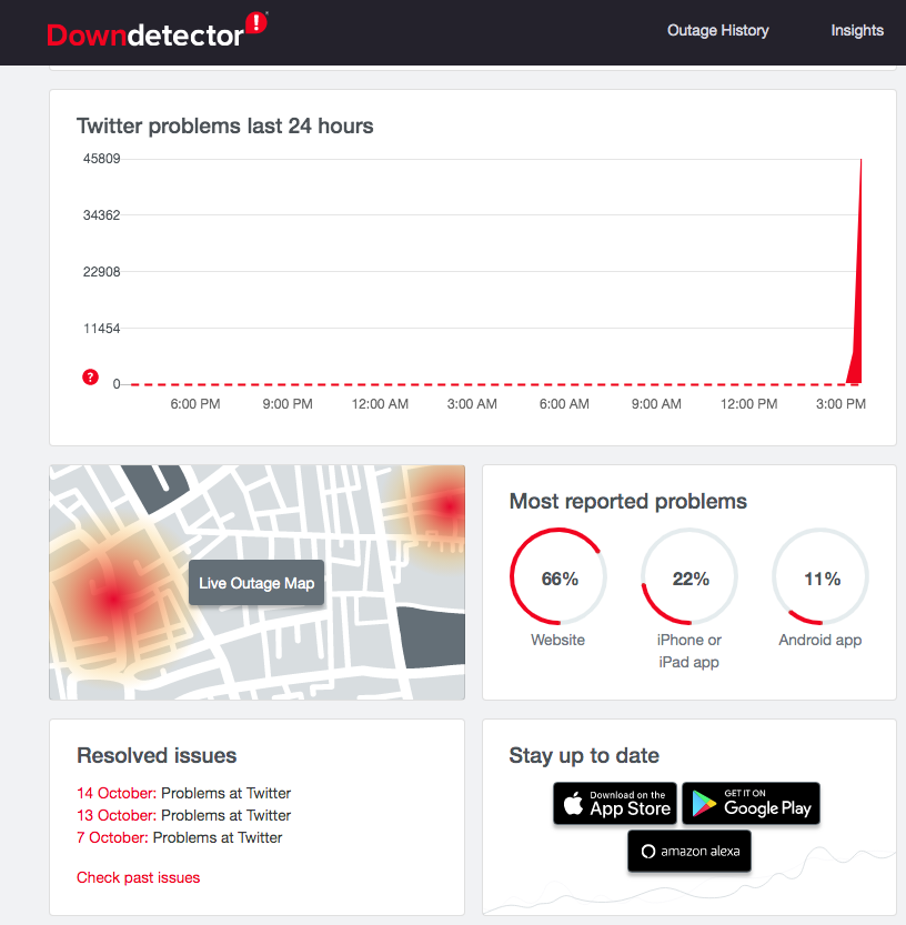 La aplicación está experimentando un colapso en gran magnitud en sus versión web de 66 %, también afecta en menor medida a los usuarios de Android en 11 %.