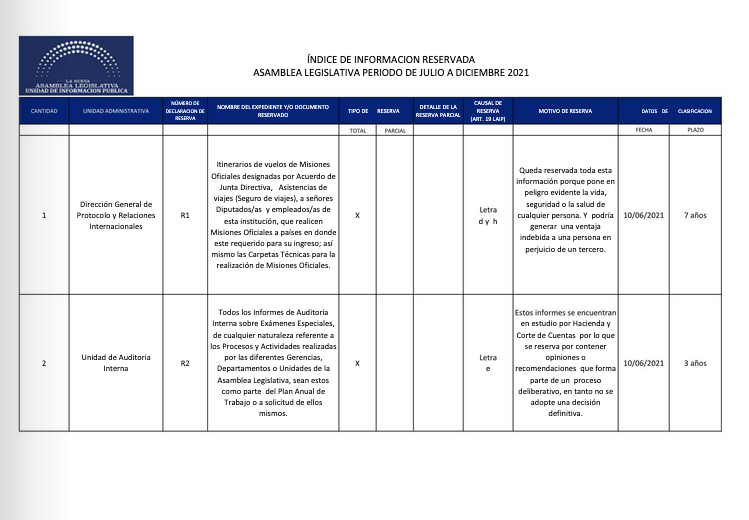 Sin embargo, en 2021, la Asamblea Legislativa dominada ya por Nuevas Ideas, clasificó, en agosto de 2021, "reserva total" para información relacionada con los viajes hasta por siete años. La información reservada en ese entonces eran los itinerarios de vuelos de Misiones Oficiales designadas por Acuerdo de Junta Directiva, Asistencias de viajes (Seguro de viajes), a señores Diputados/as y empleados/as de esta institución, que realicen Misiones Oficiales a países en donde este requerido para su ingreso; así mismo las Carpetas Técnicas para la realización de Misiones Oficiales.