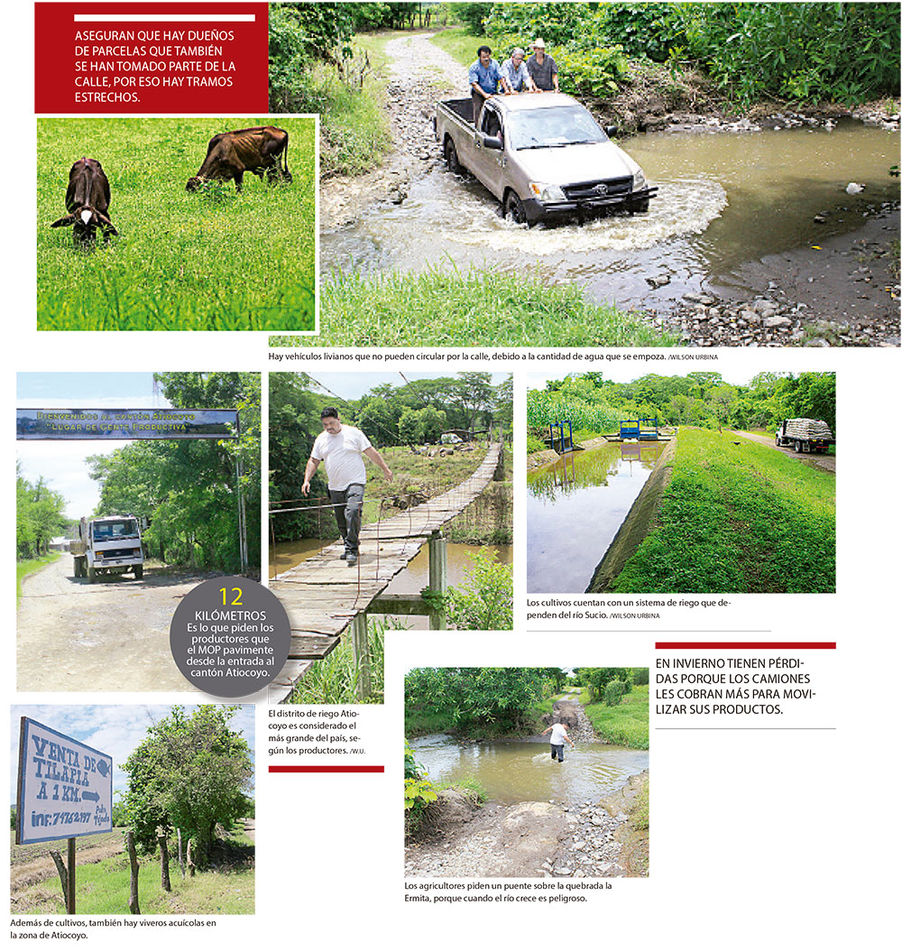 La calle no tiene canaletas, hay tramos de tierra, otros de piedra “y tiene hoyos donde el agua se empoza y no cualquier vehículo puede pasar…El problema es que a la calle no se le da ningún mantenimiento; no hay cuneta, no tiene luz, no hay nada”, dijo Douglas Henríquez, uno de los más de 300 productores que integran el distrito de riego. En la zona de Atiocoyo se cultivan granos básicos y loroco, se producen lácteos y tilapias, y se comercializa ganado. También se cuenta con una planta de procesamiento de tilapias, que permite la exportación del producto hacia Guatemala.