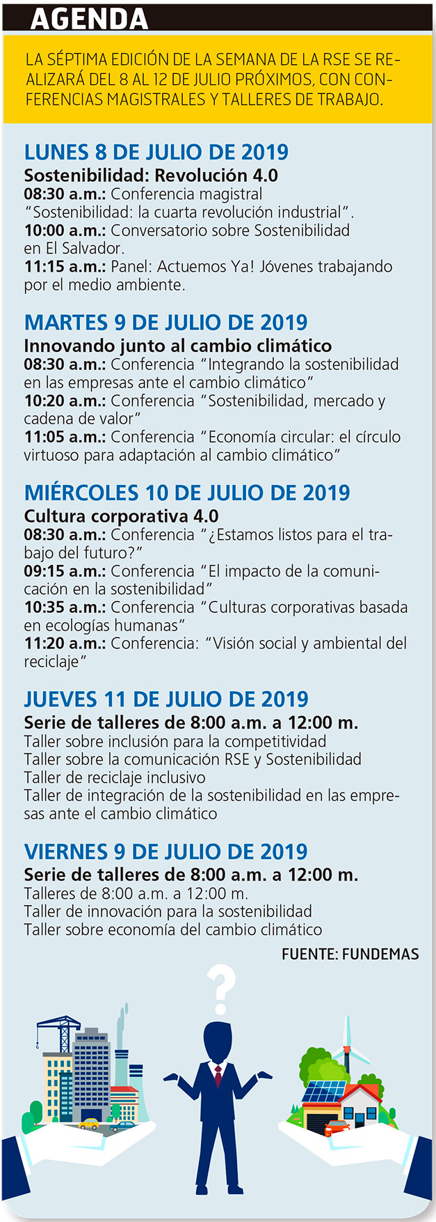 Estas temáticas abordará la séptima edición de la Semana de la Responsabilidad Social Empresarial (RSE), a realizarse del próximo 8 al 12 de julio, bajo el lema “SOStenibilidad 4.0 ¡Actuemos Ya!” porque es un llamado de emergencia de cómo El Salvador afronta “este mundo tan cambiante”, manifestó Tomás Regalado Papini, presidente de la Fundación Empresarial para la Acción Social (Fundemas).