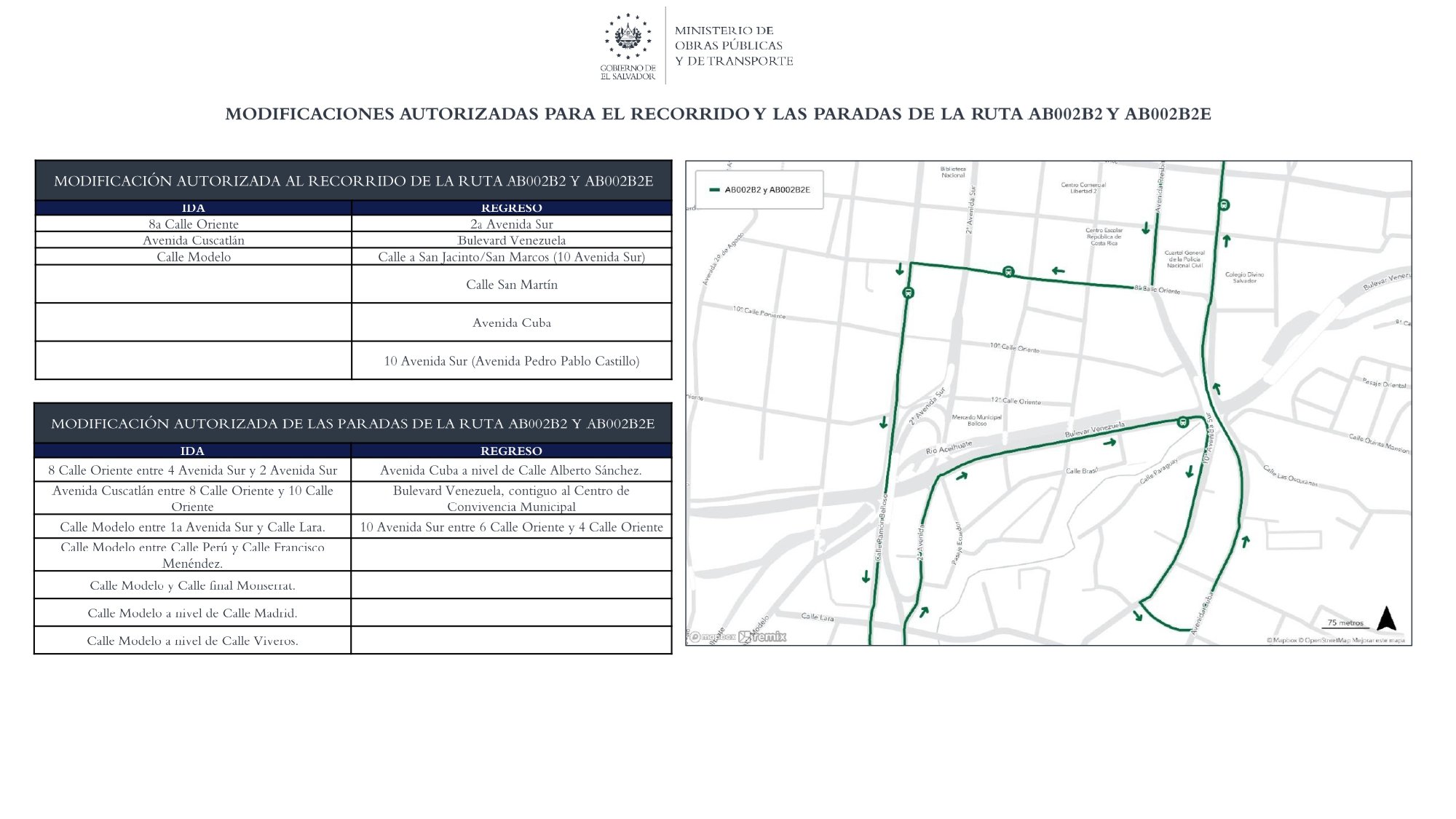 Las rutas 2 Modelo y San Jacinto, 12 microbús Los Planes, Mil Cumbres, Los Palones y El Guayabo, 48 autobús y microbús, 17-B autobús y 138-LP microbús son las que sufrirán modificaciones debido a trabajos que se realizan en la zona del Centro Histórico. La ruta 2 de la Modelo, circulará en el viaje de ida en la 8a. calle Oriente, avenida Cuscatlán y calle Modelo. A su regreso la ruta 2 circulará por la 2a. avenida Sur, el bulevar Venezuela, calle San Martín, avenida Cuba y 10 avenida Sur o avenida Pedro Pablo Castillo.