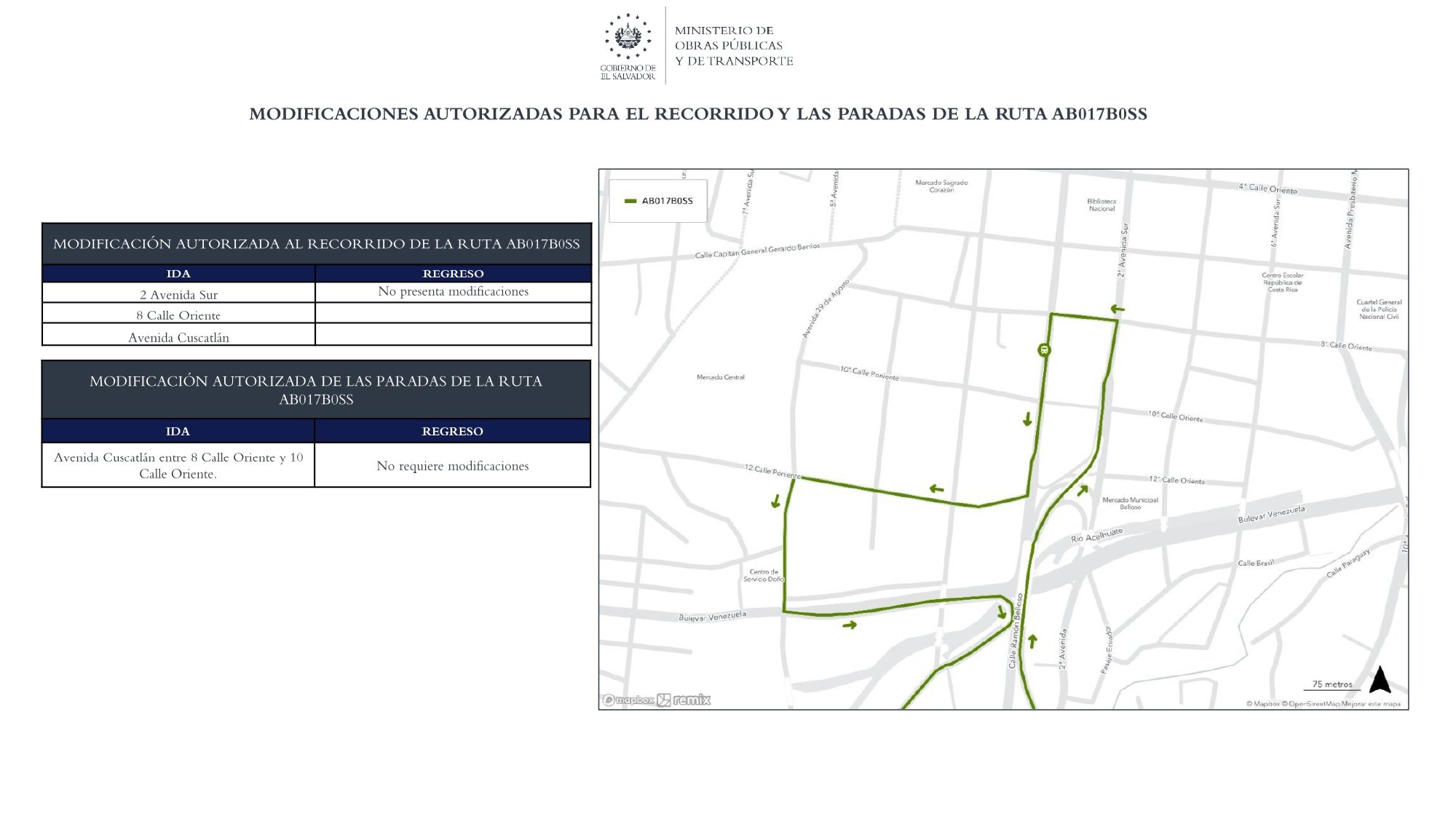 La ruta 17-B circulará por la 2 avenida Sur, 8a. calle Oriente y avenida Cuscatlán; la parada autorizada de la 17-B será en la ruta de ida en la avenida Cuscatlán, entre 8 y 10 calle Oriente.