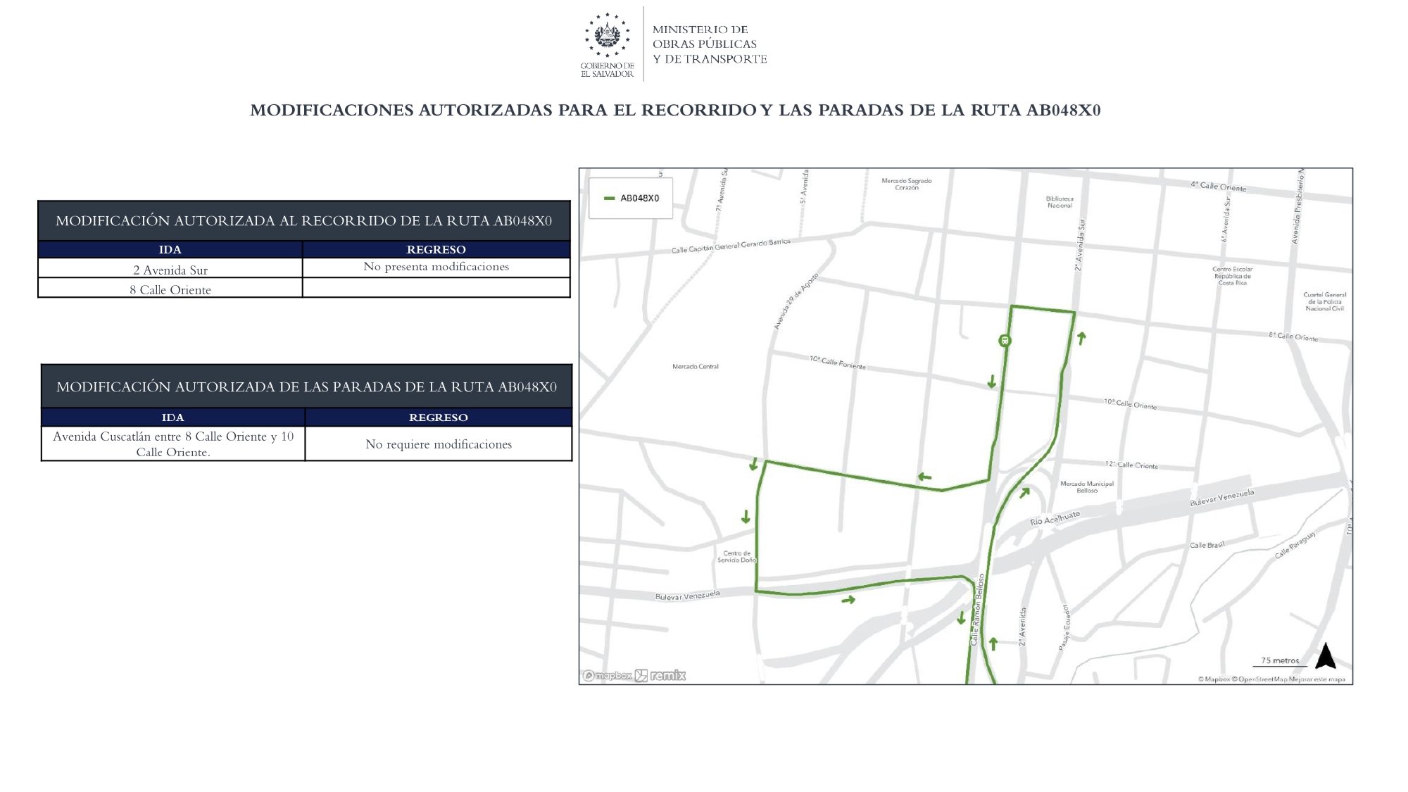 La ruta 48 microbús transitará por la 2a. avenida Sur y 8a. calle Oriente. La parada autorizada de la ruta 48 será en la intersección de la avenida Cuscatlán entre la 8 y la 10 calle Oriente.