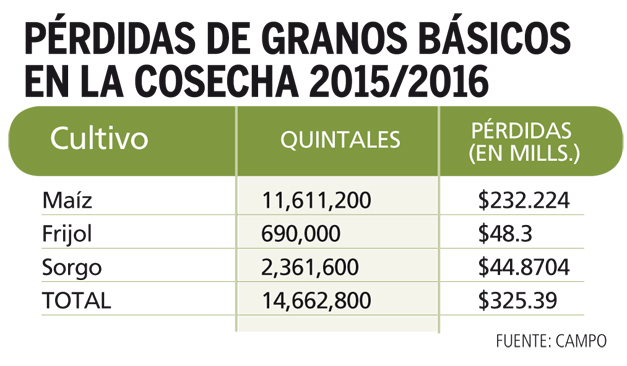 Para la cosecha agrí-cola del período 2016-2017 se prevé una pérdida de 469,000 quintales de frijol y 862,500 quintales en sorgo, según estadísticas de la Asociación Cámara Salvadoreña de Pequeños y Medianos Productores Agropecuarios (Campo).